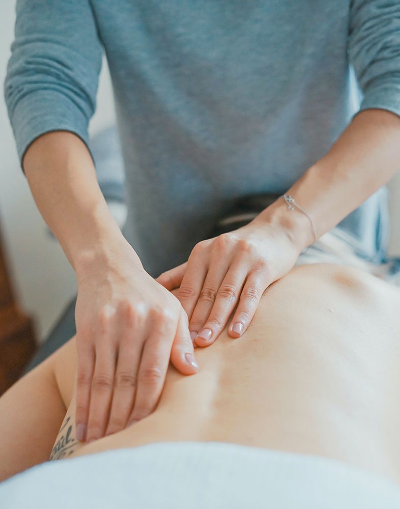 Close-up of Akasha Osteopathy massage with therapist’s hands applying holistic pressure to a client’s back.